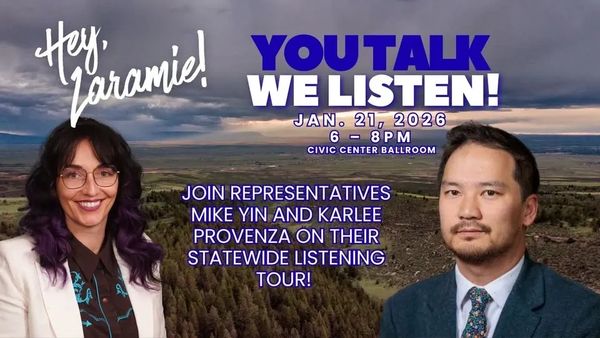 Join with the ACDems in welcoming Representatives Yin and Provenza on Wednesday, January 21st at 6pm at the Laramie Plains Civic Center Ballroom to tell them what the state should be working on and what future you want to see for Wyoming! This is the last tour date on their statewide listening tour before they head back to Cheyenne for the Budget Session that starts February 9th. Please share this post to ensure our neighbors know where to go to be heard! Bring a neighbor- bring a friend.